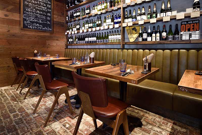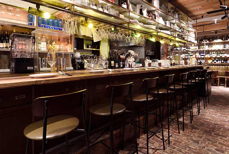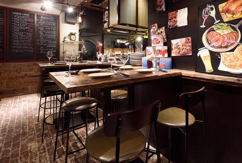 数々のボトルが並ぶワイン棚とメニューが記載されたブラックボードを眺めるハイテーブル席は、まさにビストロ感があってお酒好きにおすすめのシート。ビンテージテイストなハイチェアに腰掛け、ワイワイと賑やかな飲み会を満喫してみてはいかが。
